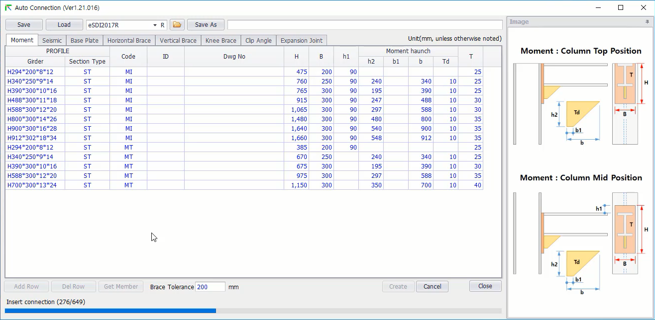 접합부 Standard 정보 입력 (Moment, Seismic, Base Plate 등)